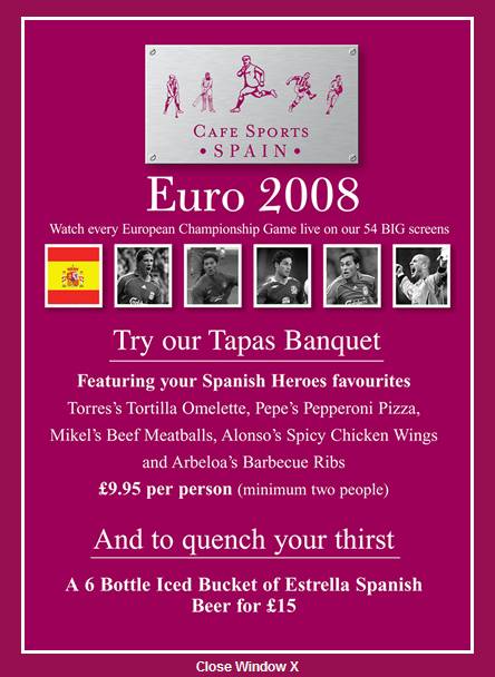 のサイトを見てみたら、どーんと"Cafe Sports Spain"の看板が出ていて特別メニューが掲載されていました。トーレス・オムレツとかペペ・ピザとか、おいしそうです。行ってみたいなあ・・・。真ん中になぜかアルテタがいてしっかりメニューに入っているのも、なんだか律儀でいいですね(笑)。オランダ料理はやらないんでしょうか。パンネンクックじゃだめか・・・。