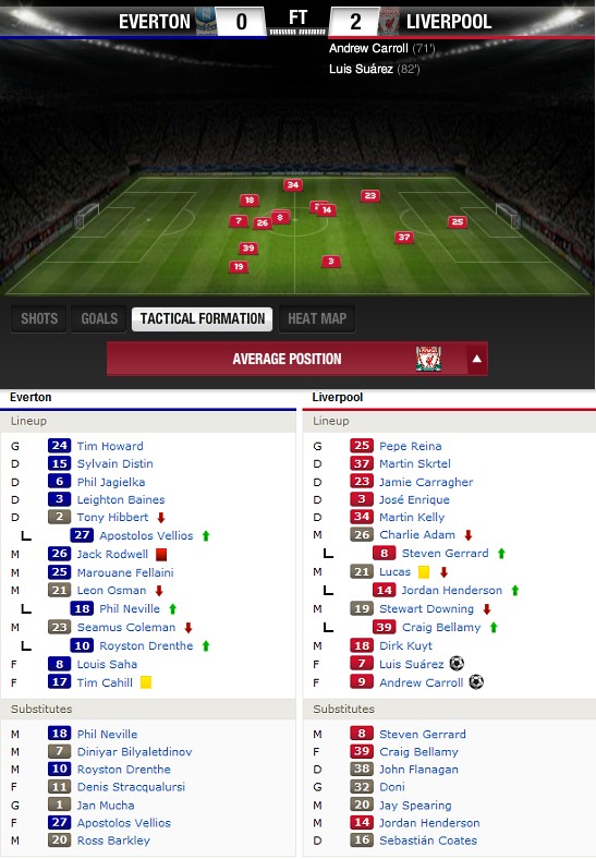 1人少なくなったエバートンはすぐさまプレーを切り替え、引いて守りに入ってカウンター狙いにシフト、スタジアムの雰囲気はにわかに搔き曇りました。リバプールが俄然試合を支配できるようになりましたが、しかしゴールに肉薄するプレーはなかなか出ませんでしたね。どうやらこの試合はキャロルがクロスやロングボールに対応できる位置取りをするよう指示を受けていたんじゃないかと思いますが、それがあまり機能していないように見えました。流れが変わったのは、後半70分にベラミーとキャプテンが同時投入されてからでした。
